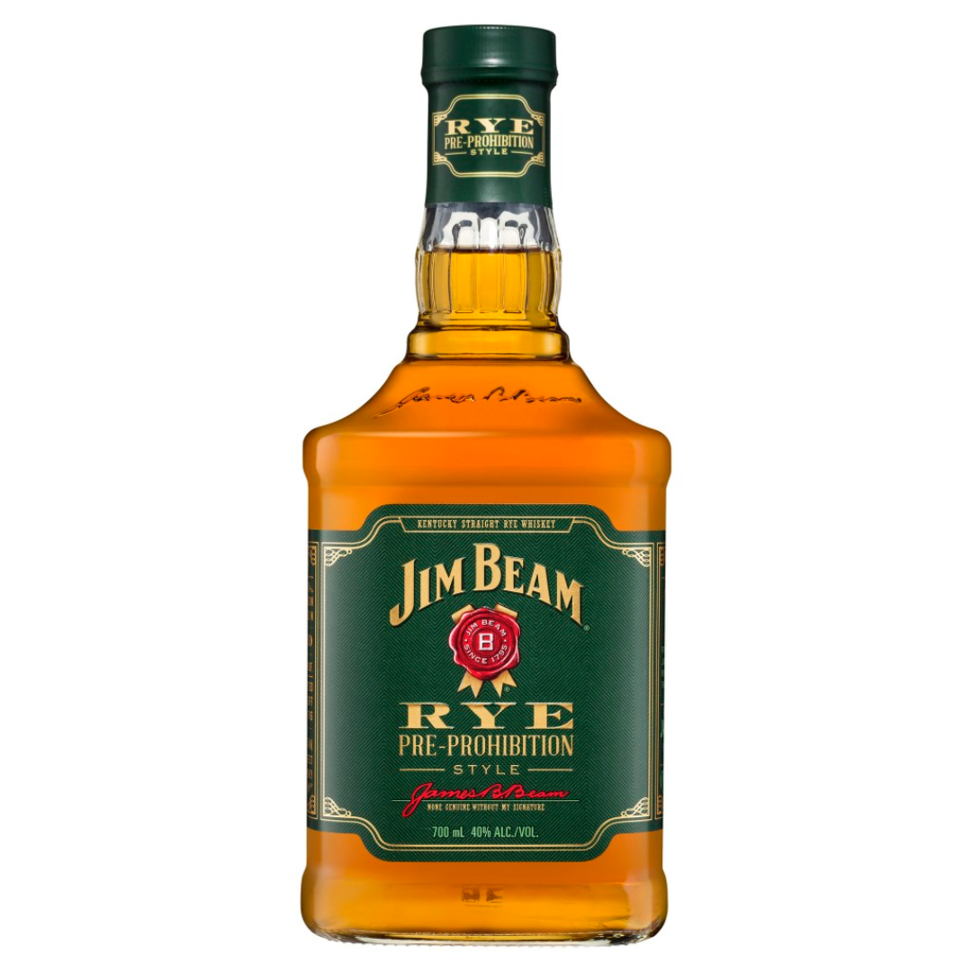 Jim Beam Rye Whiskey 700mL (40% ABV) is a Kentucky straight rye made in a pre-Prohibition style, aged in new charred white oak barrels. It delivers a bold and spicy profile with prominent notes of pepper, cinnamon, vanilla, and oak, complemented by hints of mint and cherry. The finish is long, dry, and soft, making it ideal for sipping neat or enhancing classic cocktails like the Manhattan or Old Fashioned
