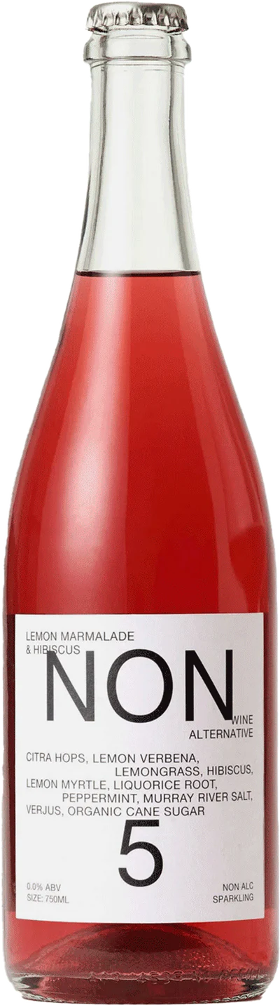 Non Non 5 Lemon Marmalade & Hibiscus 750ml is a sparkling, alcohol-free wine alternative with tart citrus, floral hibiscus, lemon myrtle, peppermint, and mild salinity from Murray River salt. Vegan, gluten-free, refreshing.