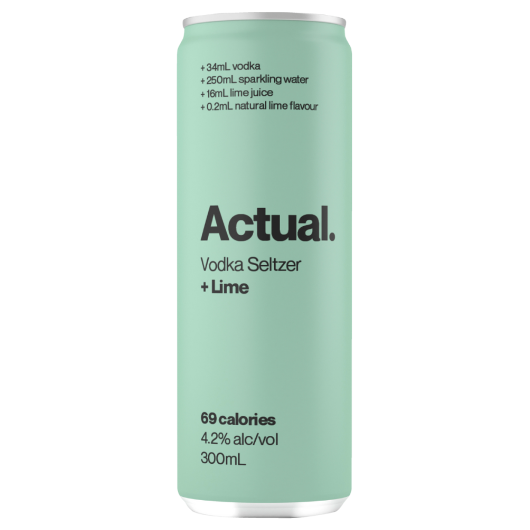 Actual Vodka Seltzer & Lime Cans 300mL is a crisp, refreshing ready-to-drink alcoholic beverage made with smooth vodka, sparkling water, and natural lime flavor. Each 300ml can contains 4.2% ABV and provides 1 standard drink per can