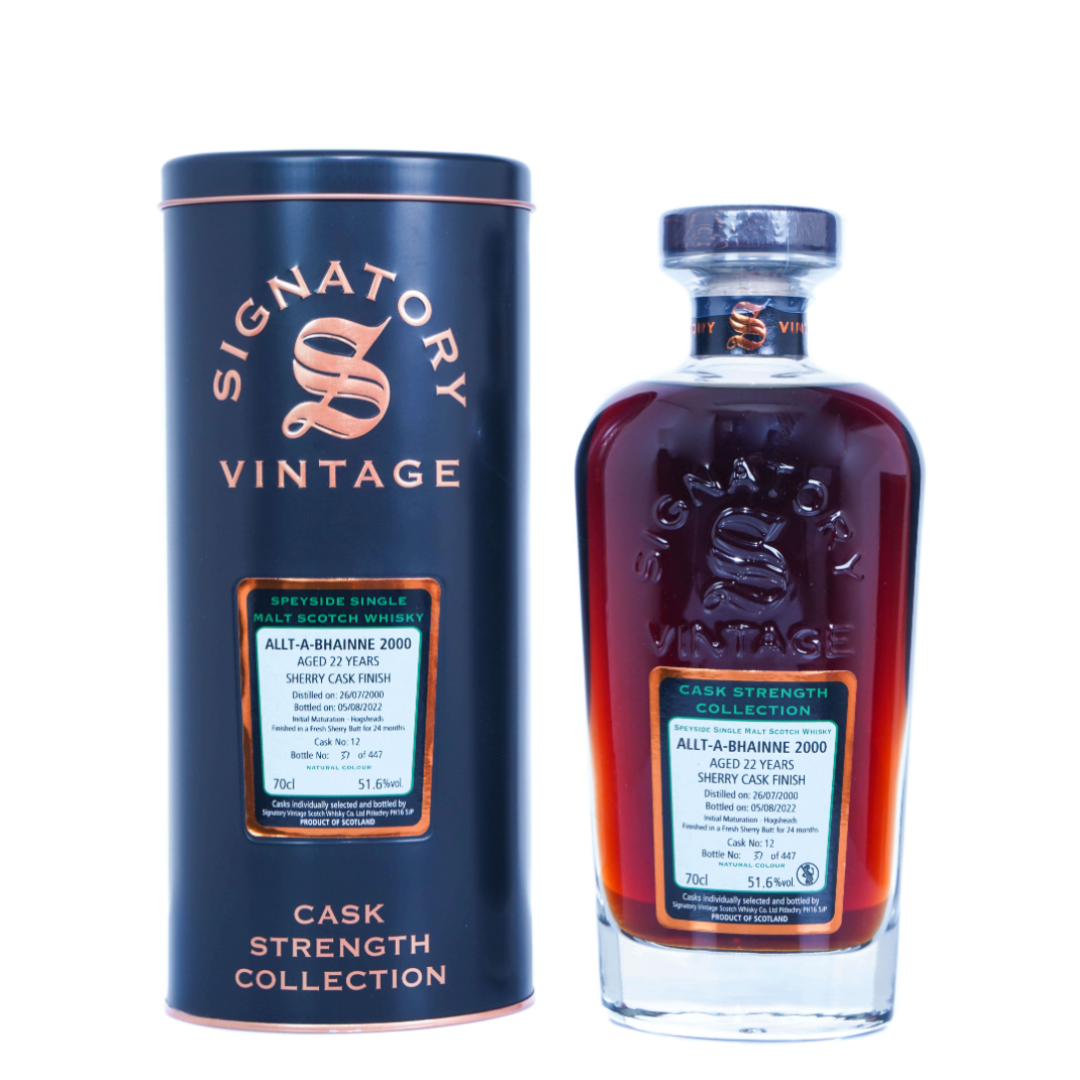 Allt-a-Bhainne 2000 Aged 22 Years Cask Strength Single Malt Scotch Whisky - Signatory Vintage: Rich sherry cask matured, 52.3% ABV, with dried fruits, caramel, nuts, spices, licorice, tobacco notes, and long finish