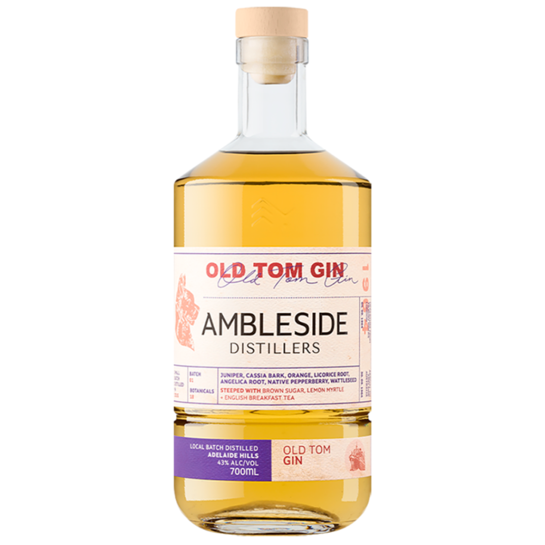 Ambleside Distillers Old Tom Gin 700ml combines traditional Old Tom botanicals with native Australian flavors. It features piney juniper, bright citrus botanicals like orange and lemon, and sweet notes from brown sugar, English Breakfast tea, and lemon myrtle. The gin has citrus, lingering spice, malt, pepper, and pine notes, perfect for a classic Tom Collins or served over ice with orange