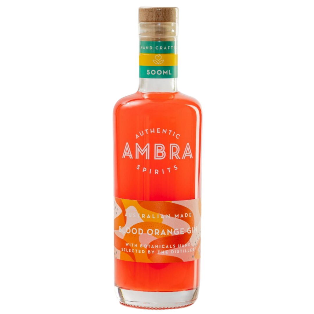 Ambra Blood Orange Gin 500ml is a handcrafted Australian gin with 30% alcohol by volume. It features infusion of local blood orange peel, juniper, coriander seeds, and licorice root, delivering a vibrant blood orange burst balanced on a clean gin base. It is gluten-free and enjoyed neat or in cocktails.