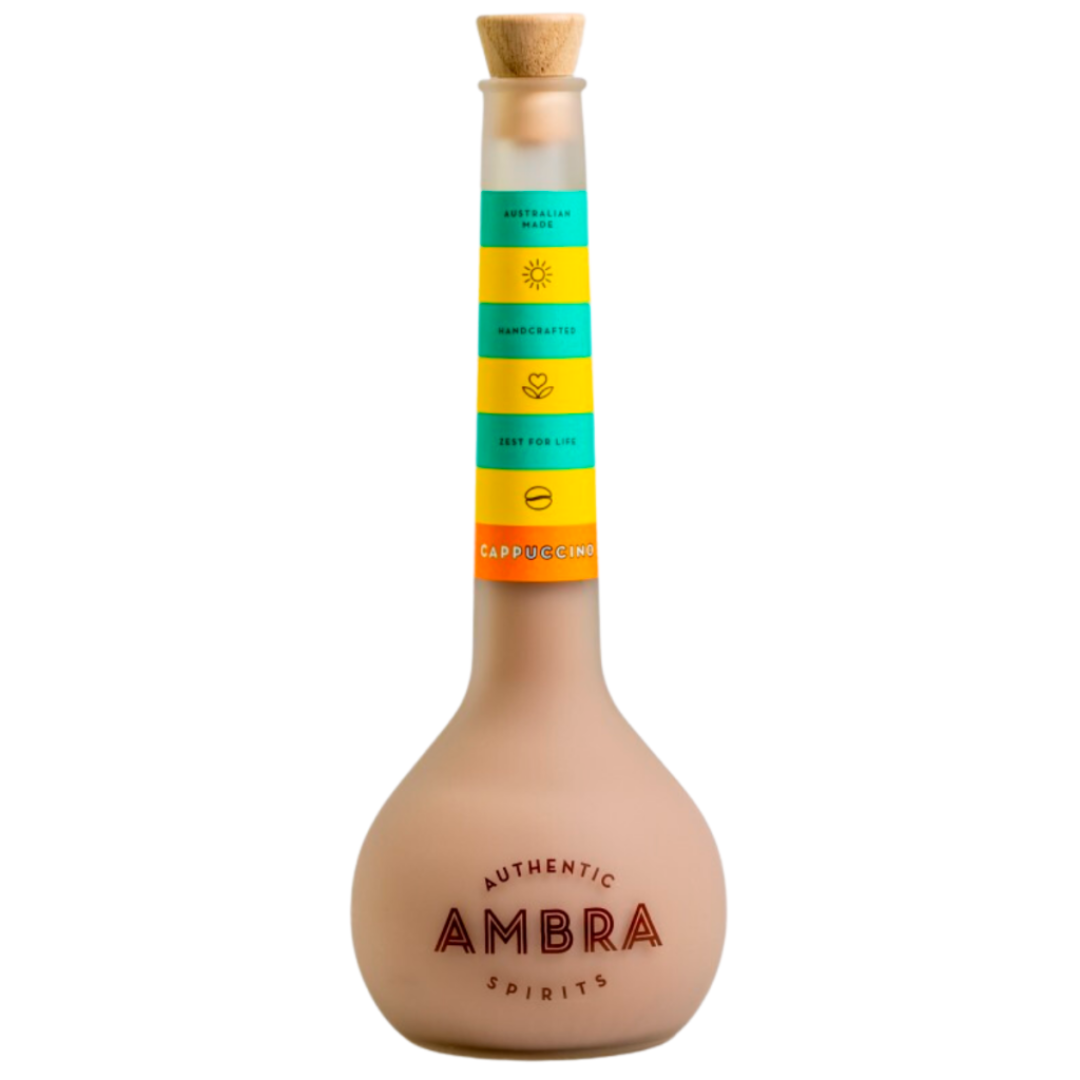 Ambra Cappuccino 500ml is a velvety, creamy coffee liqueur with 18% ABV, crafted in South Australia. Inspired by an authentic Italian family recipe, it features rich aromas and flavors of fresh espresso, coffee beans, and chocolate. Perfect chilled on ice or in coffee-based cocktails. Gluten-free, contains dairy