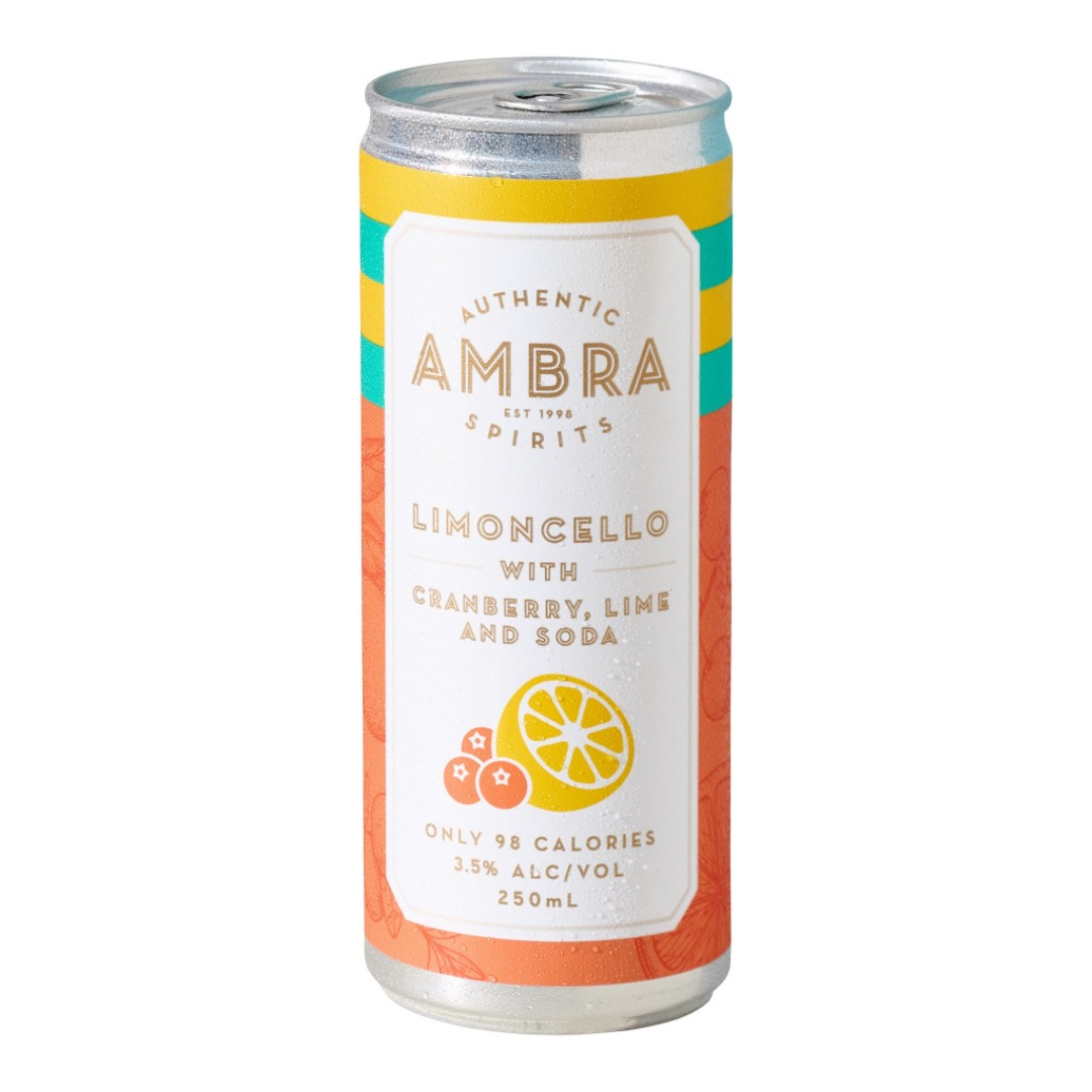 Ambra Limoncello With Cranberry, Lime And Soda 250ml is a refreshing Australian premixed drink, available in a pack of 24 cans. It combines Ambra's award-winning limoncello with cranberry, a hint of lime, and soda for a bright, zesty flavour profile.