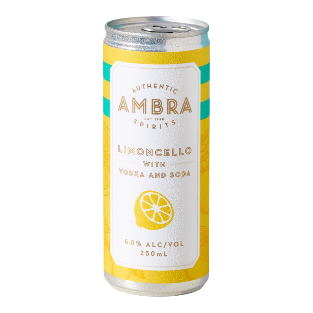 Ambra Limoncello With Vodka And Soda 250ml comes in a convenient pack of 24 cans. It is a premixed refreshing drink combining premium Italian-style limoncello with vodka and soda, offering vibrant lemon zest flavors with 6% ABV.