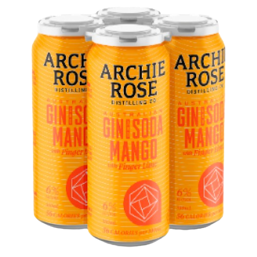 Archie Rose Straight Dry Gin & Mango Soda with Finger Lime 330ml combines cold-distilled Aussie gin infused with lemon myrtle, reclaimed orange peel, and pink peppercorn with refreshing mango soda and native finger lime.