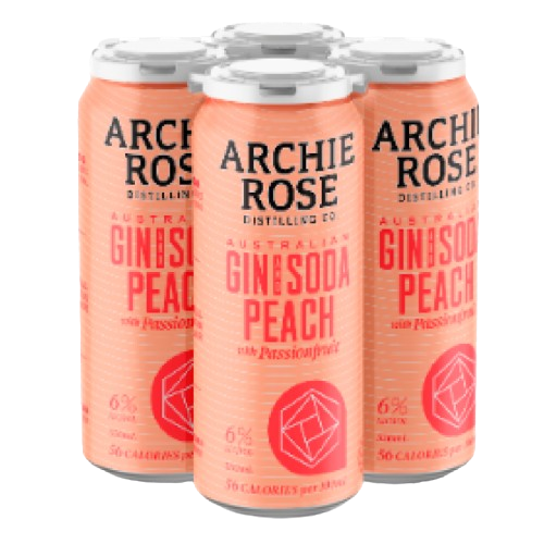 Archie Rose Straight Dry Gin & Peach Soda With Passionfruit 330ml blends cold-distilled Australian gin with juicy peach soda and zingy passionfruit. It’s a refreshing, fruity 6% ABV premix, perfect for summer.