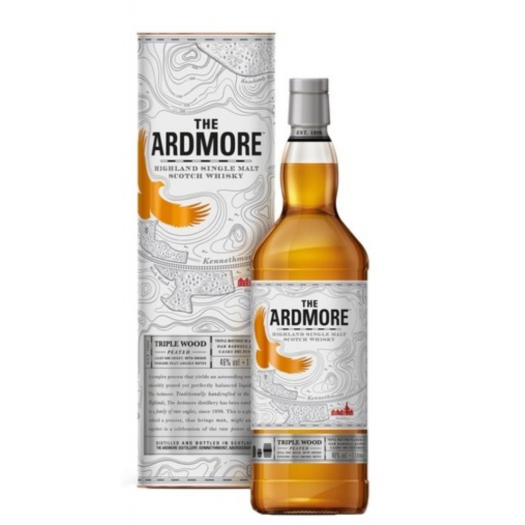 Ardmore The Triple Wood Single Malt Scotch Whisky 1LT is a Highland single malt matured through a unique triple cask process, involving American oak barrels, quarter casks, and European oak puncheons. Bottled at 46% ABV, it is celebrated for its complex flavor profile combining rich oak influence and traditional Highland peat smoke.