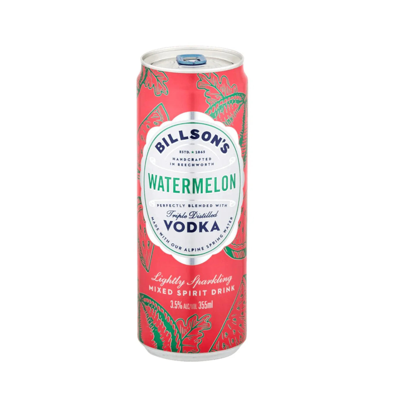 Billson's Vodka & Watermelon 355ml (Pack of 24) is a premixed vodka beverage crafted with Billson's triple distilled vodka made from pure alpine spring water sourced from Beechworth, Victoria, Australia. It is blended with natural watermelon flavor and classic sodas, resulting in a light, sparkling mixed spirit with a refreshing watermelon taste. The drink has an alcohol content of 3.5% ABV.