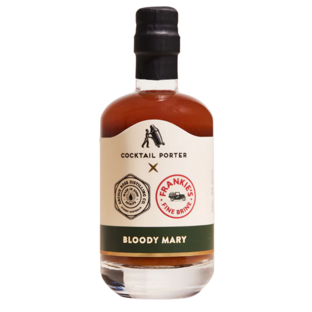 Cocktail Porter 'Archie Rose Bloody Mary' 500ml is a ready-to-drink bottled cocktail combining Archie Rose Original Vodka with Frankie's Fine Brine Classic Bloody Mary Mix and a swig of signature pickle brine. It is designed to deliver the classic Bloody Mary flavors with tomato juice, spices, and a savory pickle twist for added character. The cocktail has 10% alcohol by volume and comes ready to shake and pour over ice. Common garnishes include a pickle and a celery stick to complement the flavor.