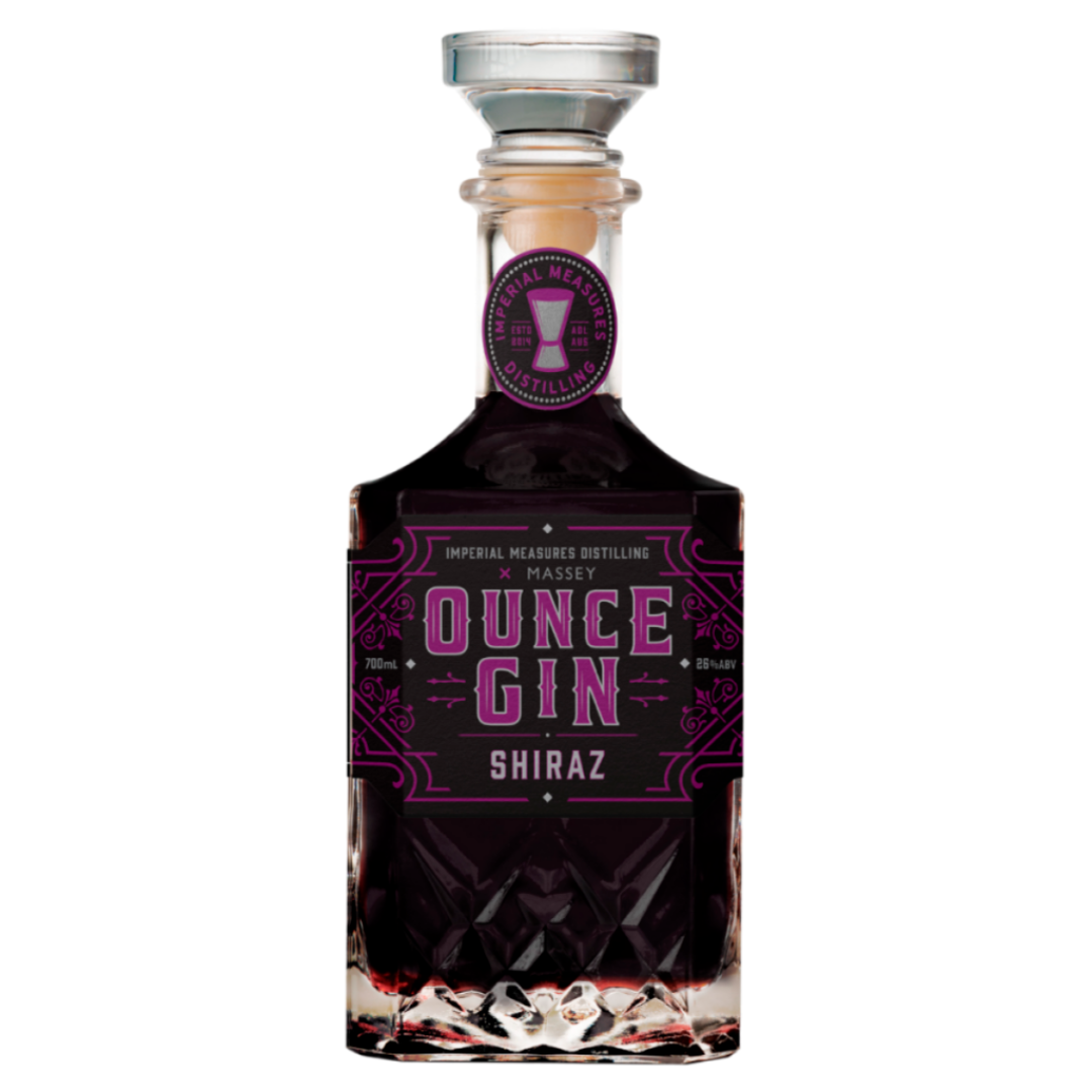 Imperial Measures Distilling Ounce Gin Shiraz 700ml blends traditional gin botanicals with dark fruit-forward Shiraz grapes, featuring juniper, grapefruit, hibiscus, elderberry, cinnamon, and black pepper for a rich, spiced flavor.