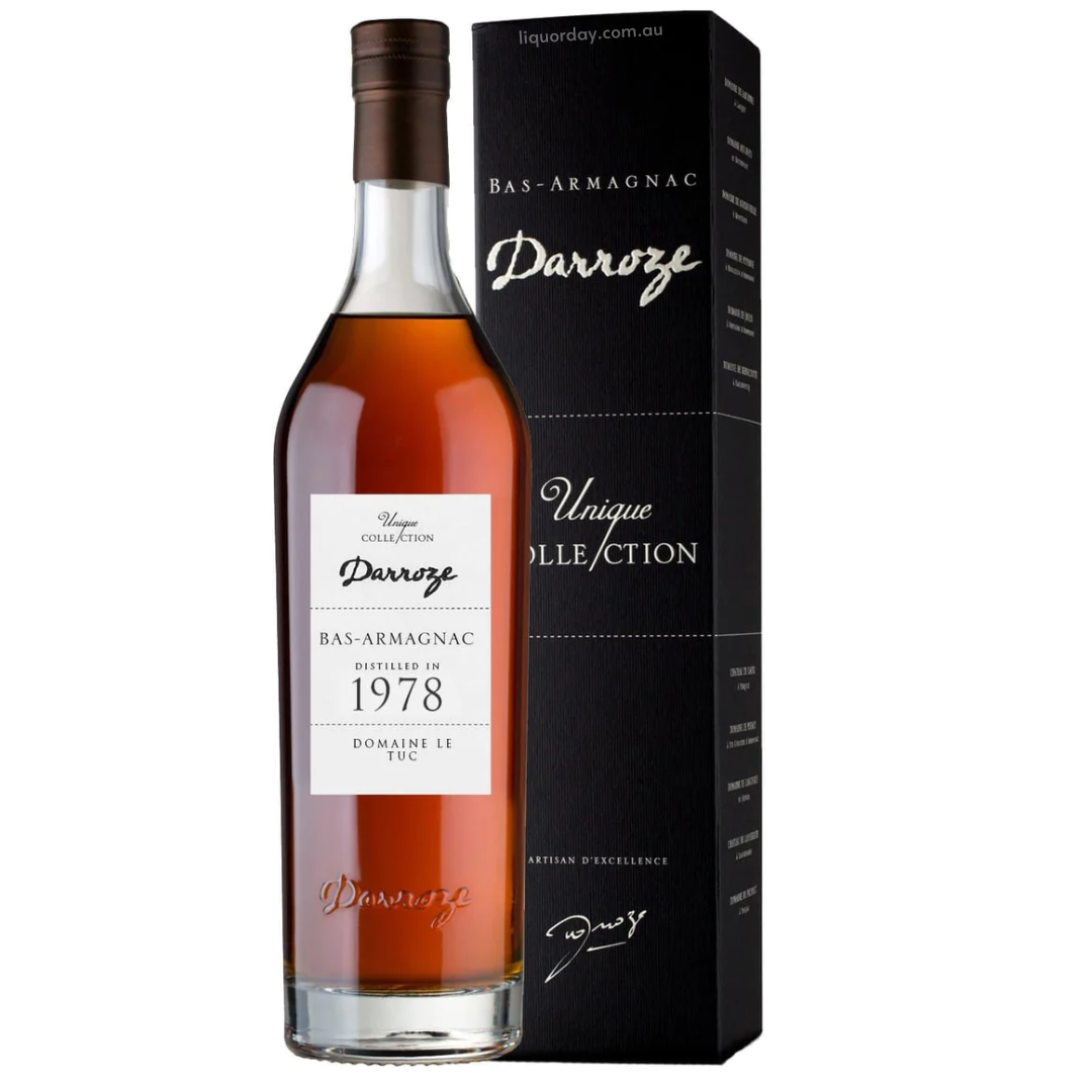 Darroze 1978 Le Tuc Grand Bas Armagnac (700ml, 48.5% ABV) is a highly esteemed aged Armagnac with a rich amber color and golden highlights. It features dominant aging aromas of cocoa, licorice, leather, and tobacco, offering intensity and finesse in one package. On the palate, the tannins are silky and gently sweet, unfolding an aromatic explosion of candied fruits, spices, and rancio, with a long and satisfying finish. This vintage is praised for its complexity, roundness, and elegant maturation, reflecting the distinctive terroir and craftsmanship of Domaine Le Tuc.