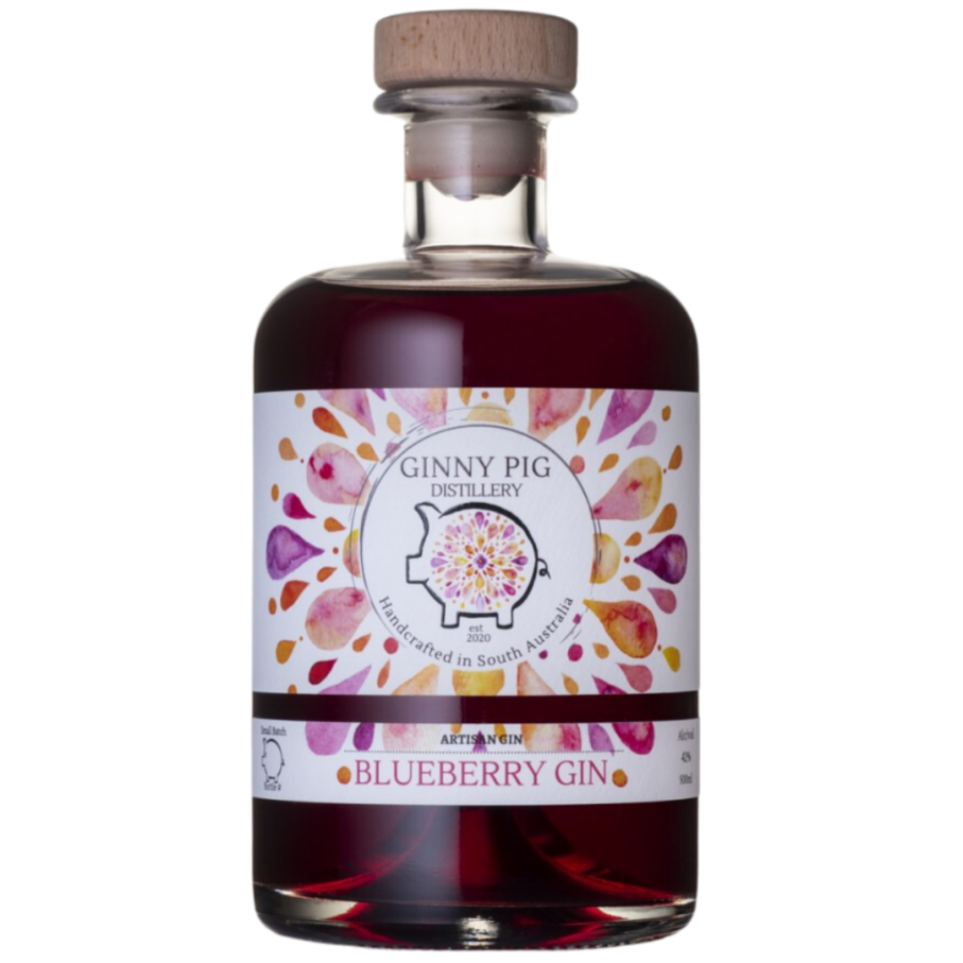 Ginny Pig Distillery Blueberry Gin 500ml is a South Australian small batch gin with 42% ABV, blending juniper, blueberry, and vanilla for a smooth, balanced, and fruity flavor.
