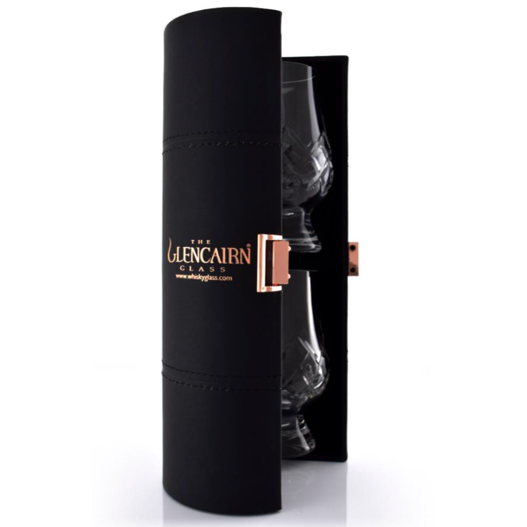 The Glencairn Cut Crystal 'Tartan' (qty2 in Travel Case) set features two mouth-blown, hand-cut tartan pattern crystal whisky glasses, presented in a black leatherette travel case with copper details. Each 170ml lead crystal glass is food safe, dishwasher safe, and uniquely crafted for whisky enjoyment