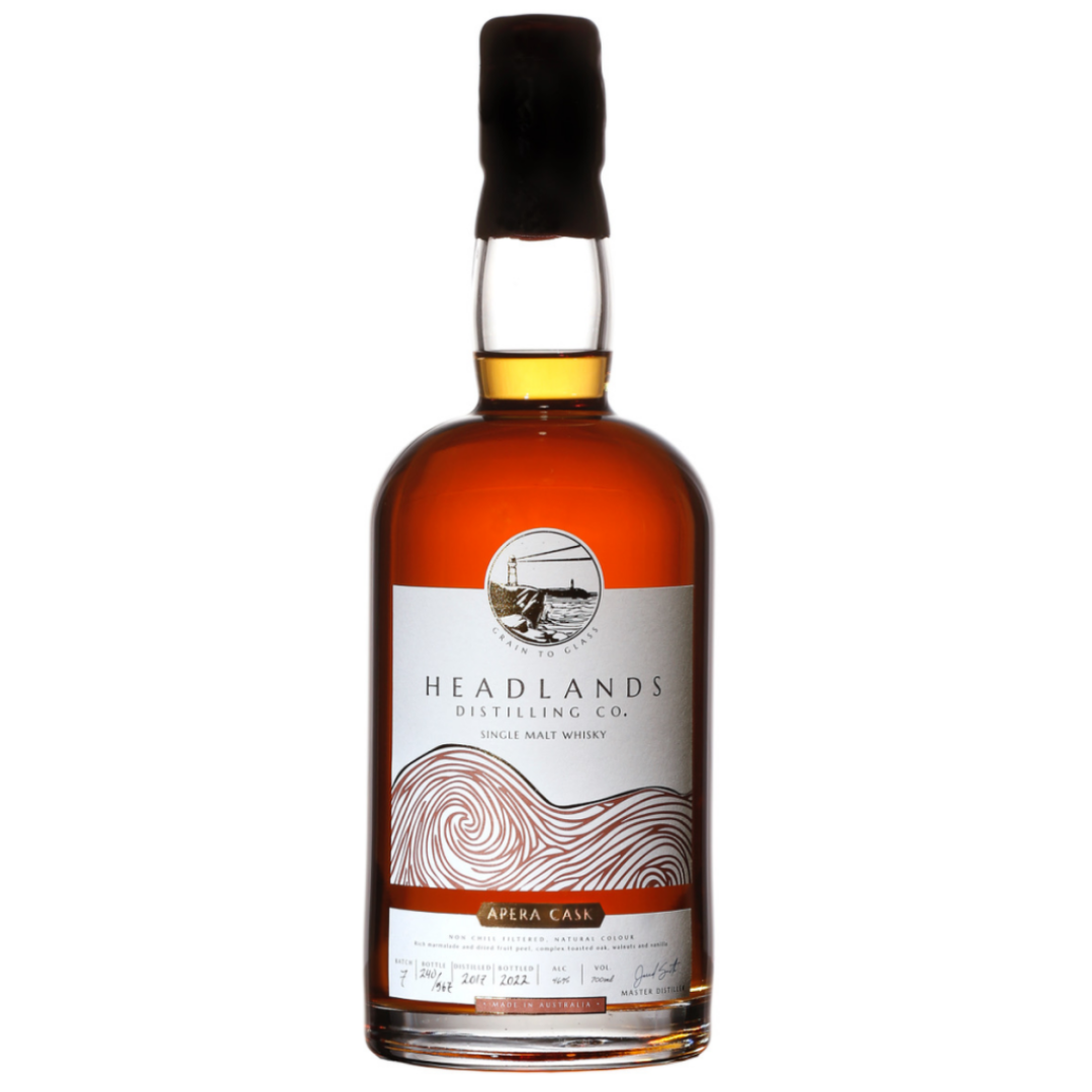 Headlands Distilling Company Apera Cask Whisky 700ml is a premium Australian single malt whisky from Wollongong, New South Wales, bottled at 46% ABV. It is matured in oak casks seasoned with 18-year-old Seppeltsfield Rare Rich Apera wine, a fortified wine made from Palomino and Grenache grapes grown in South Australia's Barossa Valley. This gives the whisky a uniquely Australian style reminiscent of a Spanish Oloroso sherry influence.