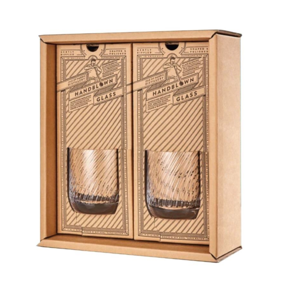 Isle of Harris Twin Tumbler Glass Gift Set includes a 700ml Isle of Harris Gin (45% ABV) and two handcrafted, gently rippled glass tumblers. The set is beautifully presented in a bespoke gift box, perfect for gifting or personal enjoyment, highlighting the gin's fresh, maritime botanicals and smooth finish.