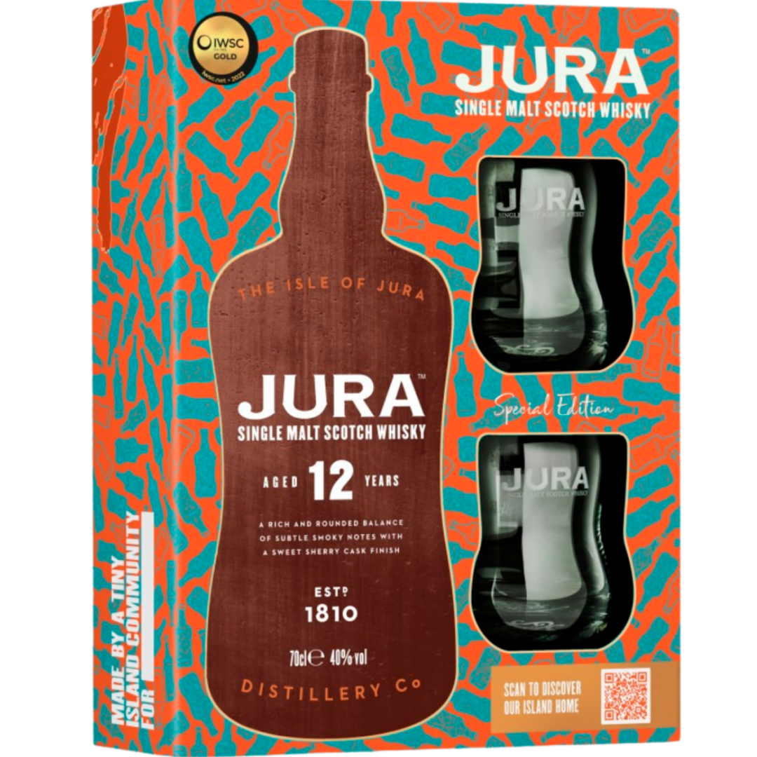 Isle of Jura 12 Year Old Glass Gift Pack 700ml is a single malt Scotch whisky from the Scottish Isle of Jura, offered in a gift set that typically includes a bottle of Jura 12 Year Old along with a branded whisky glass for an enhanced tasting experience.