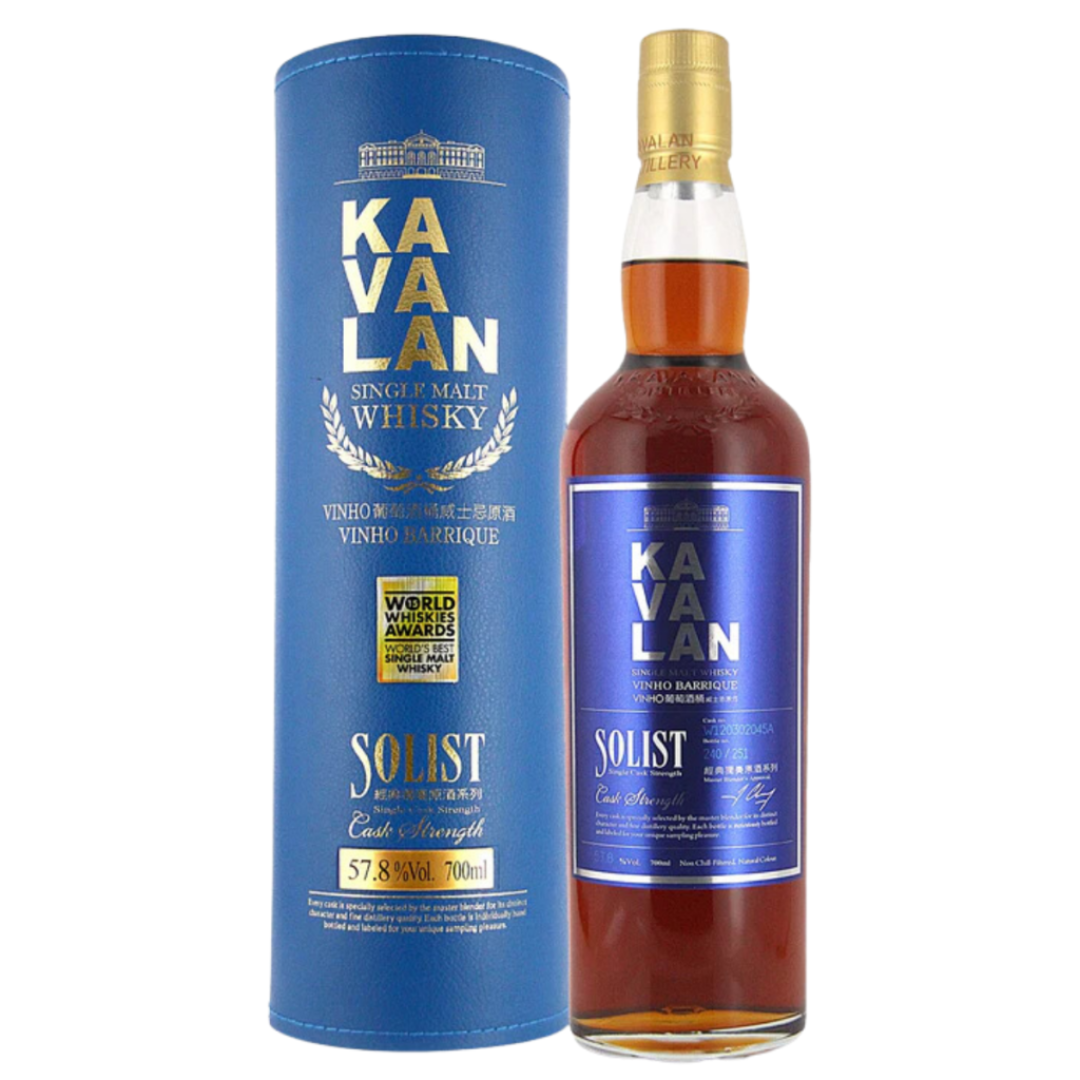 Kavalan Solist Vinho Barrique Single Malt Whisky (700ml, ~57% ABV) is matured in re-charred American oak wine barrels, bringing fruity vanilla notes, deep autumn gold color, and a complex palate of rich vanilla, caramelized sugars, dark chocolate, ripe melon, mango, kiwi, and citrus with a long, clean finish