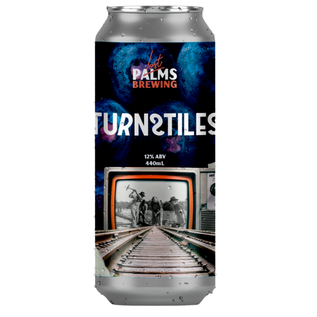 Lost Palms Turnstiles Quad Blueberry Pancakes Sour Ale 440ml Can - Pack of 16 is a sour ale brewed in Queensland, Australia. It features vibrant blueberry aromas with subtle notes of caramelized sugar and vanilla, giving it a unique dessert-like character reminiscent of blueberry pancakes. The ale is moderately tart with a sweet and sour balance, having an ABV of around 7%. This quirky craft beer combines fruity sour berry flavors with a smooth, approachable profile.