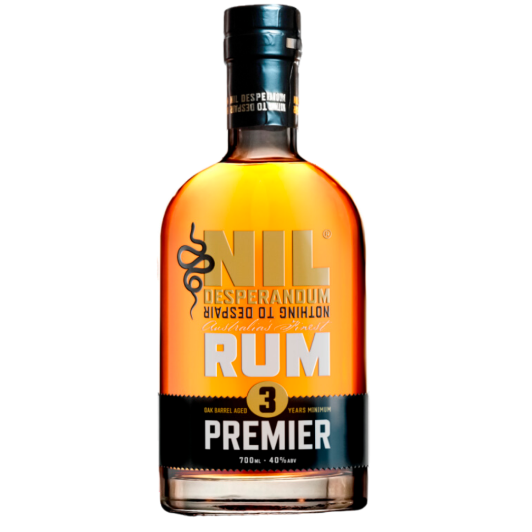 Nil Desperandum Premier Rum 700ml is an Australian Certified Organic rum, wild fermented using locally sourced organic molasses, Woombye water, dunder, and muck. It undergoes double pot distillation and is aged for a minimum of 3 years in bourbon barrels previously emptied of sherry and port, located on Australia's Sunshine Coast. The rum offers a tantalizing nose with caramel, crème brûlée, dried apricots, figs, dates, toffee, and maple syrup. On the palate, it delivers rich and powerful flavors of maple syrup, caramel, and tropical fruits, making it a complex and refined sipping rum without any additives or sweeteners