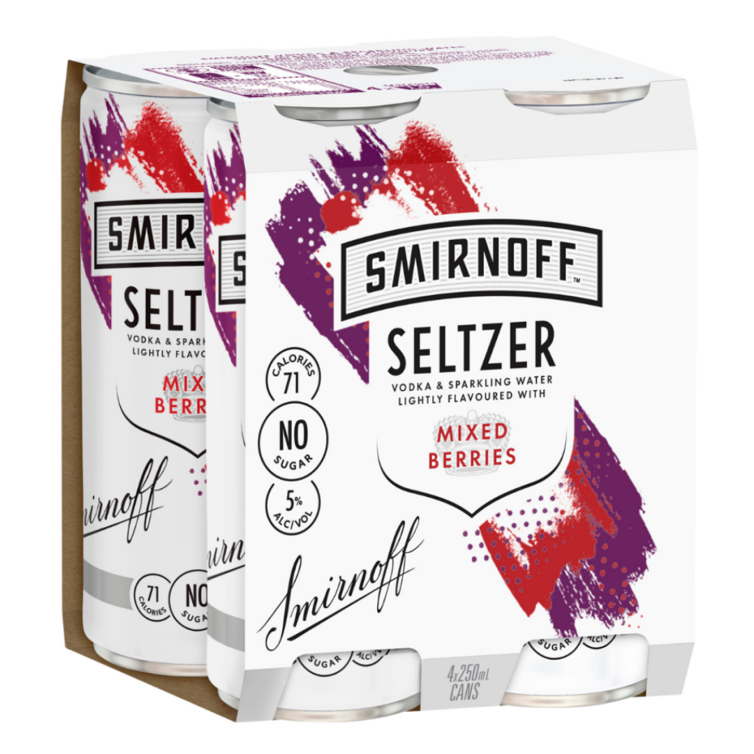 Smirnoff Seltzer Mixed Berries 250mL – Pack of 24 contains refreshing ready-to-drink cans featuring Smirnoff vodka, sparkling water, and natural mixed berries flavour. Each can has 5% alcohol by volume (ABV), zero sugar, and approximately 70–71 calories.