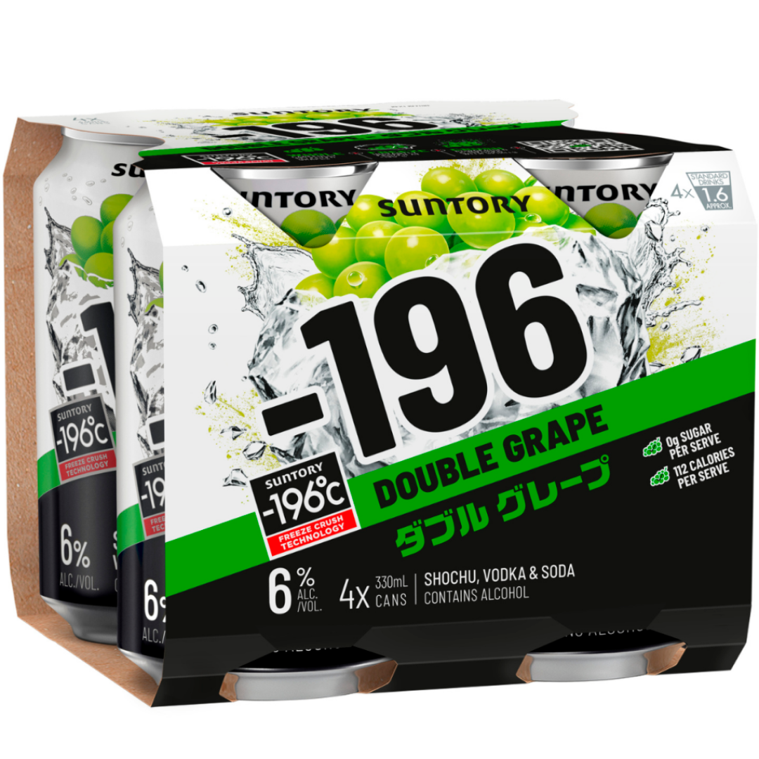 Suntory -196 Double Grape 330mL – Pack of 30 is a premium Japanese-inspired alcoholic premix combining shochu, vodka, and soda, celebrated for its crisp, slightly sour, bubbly grape fizz and full-fruit flavour. Each can uses Suntory’s unique Freeze Crush Technology™: whole grapes are frozen at -196°C, crushed, and infused into the spirit for bold, authentic taste.
