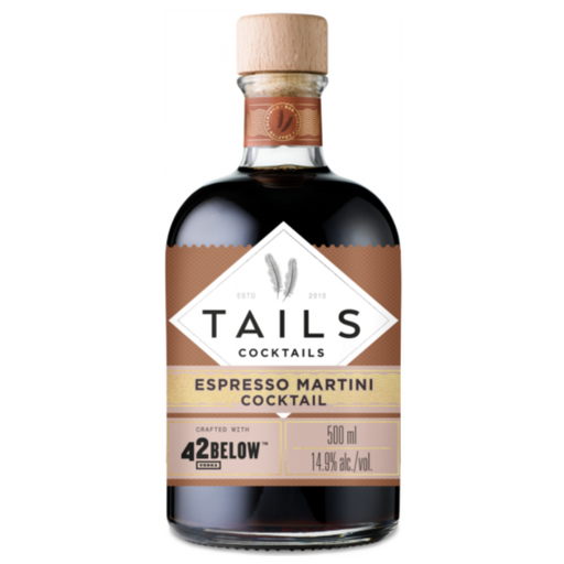 Tails Cocktails Espresso Martini 500ml is a premium ready-to-serve cocktail made with 42Below vodka, coffee liqueur, and premium espresso coffee. It has an alcohol content of 14.9% ABV and serves approximately 6 standard drinks per bottle. The cocktail delivers a rich, bitter coffee flavor balanced with the smoothness of vodka and a sweet, silky finish.