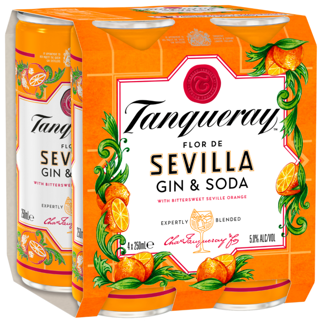 Tanqueray Sevilla Gin & Soda Cans 24 x 250ml is a premium ready-to-drink beverage combining Tanqueray London Dry Gin, vibrant Seville orange flavors, and soda in a convenient can. Each can contains 250ml with 5.0% ABV for one standard drink per can.