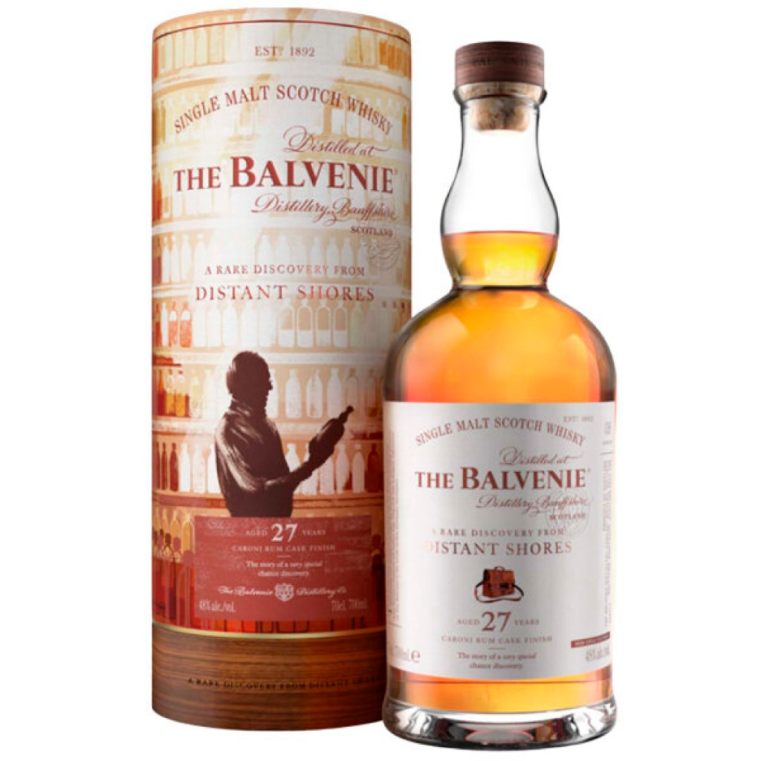 The Balvenie 27 Year Old Distant Shores (700ml) is matured 20 years in American oak casks, finished 7 years in rare Caroni rum casks. It has rich vanilla, caramel, toasted oak, honey, dried fruit, and spice notes with a long, velvety finish at 48% ABV. Limited and highly sought-after