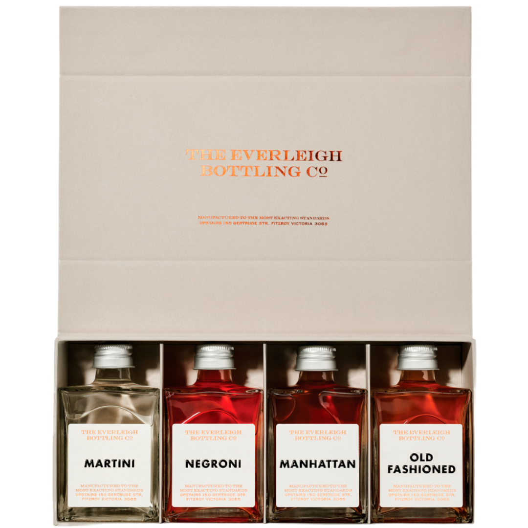 The Everleigh Bottling Co The Famous Four Gift Set 4 x 90ml includes four iconic and timeless classic cocktails: Martini, Negroni, Manhattan, and Old Fashioned. Each cocktail is meticulously handcrafted in Melbourne using premium spirits to deliver bold and sophisticated flavors.