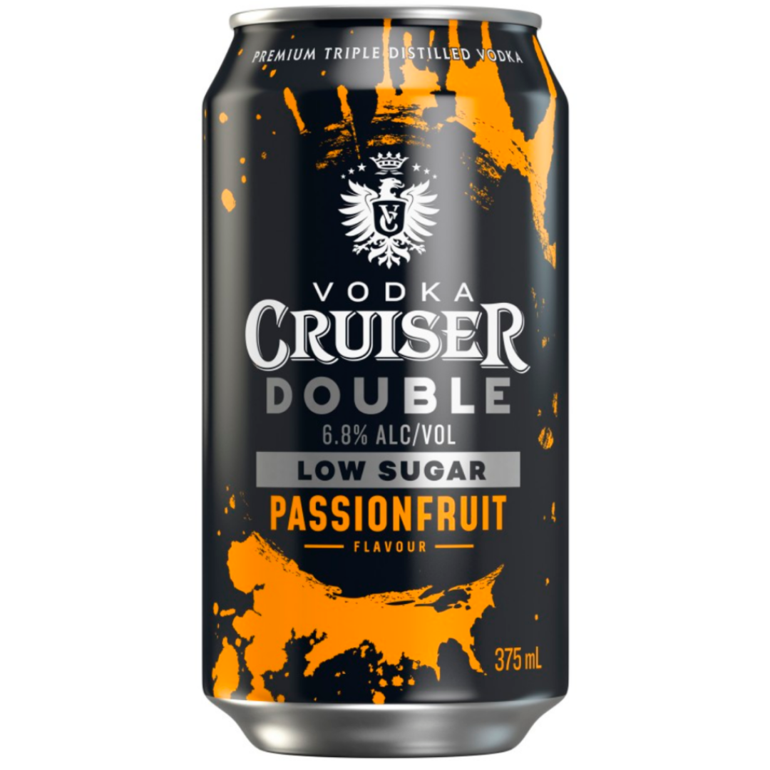 Vodka Cruiser Double Passionfruit Low Sugar 375ml (24 pack) is a ready-to-drink vodka premix featuring tropical passionfruit flavor blended with premium triple distilled vodka. It contains 6.8% ABV, with 65% less sugar than regular Vodka Cruiser Double variants, providing a punchy, fruity, and refreshing drink that's perfect for sharing.