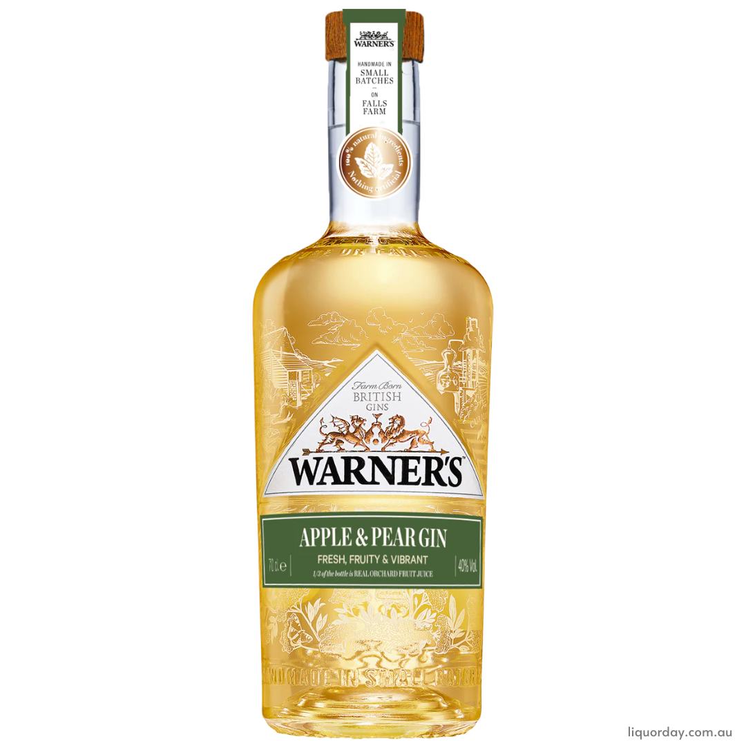 Warner's Apple & Pear Gin 700ml is a fruity English gin made with one-third real apple and pear juice, hand-picked elderflower, and classic botanicals. It offers a fresh, vibrant taste reminiscent of British countryside, with floral elderflower, cardamom spice, juicy orchard fruits, and a smooth finish